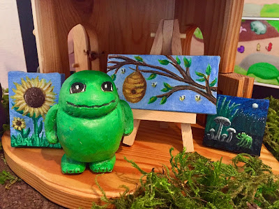 Nick and I spent a rainy afternoon working on these mini paintings for the art studio. It was so fun and low key! It made me want to work on some more miniature paintings in the near future, not necessarily nomchom related, but I do like the size and how quickly I was able to complete one. Usually, I have to spend a minimum of three weeks on a painting. Note: The evening/glowing mushroom painting is Nick's creation. The other two are mine.